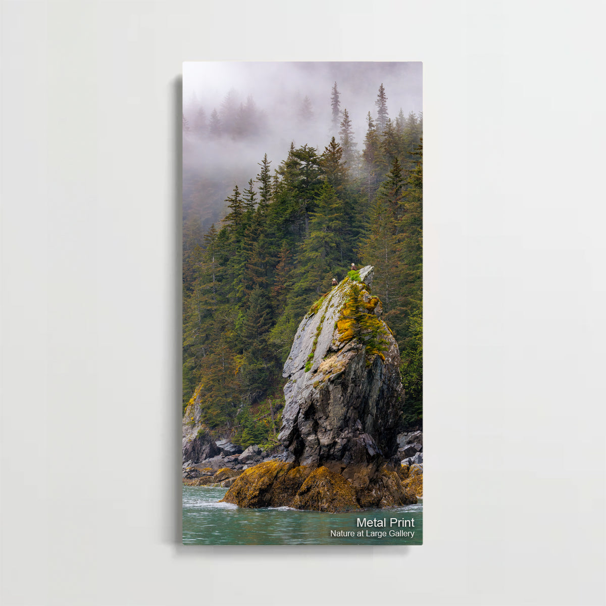 Two Bald Eagles perch atop a spire in coastal Alaska.